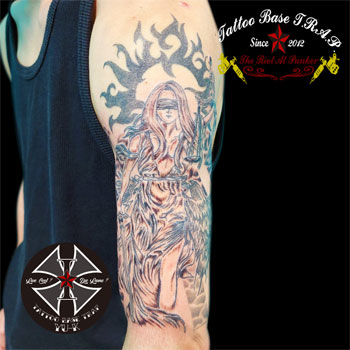 男性の腕に《テミスの女神のタトゥー》