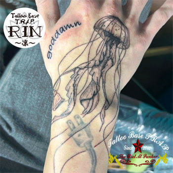 既存のデザインに寄せコンセントを追加させていただいた少し変わったクラゲちゃんを、なかなかのファンキーゾーンに施術させて頂きました😊