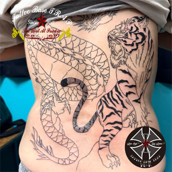 続いて女性の背中に《龍虎図の刺青》