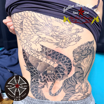 まずは女性の背中に《龍虎図の刺青》